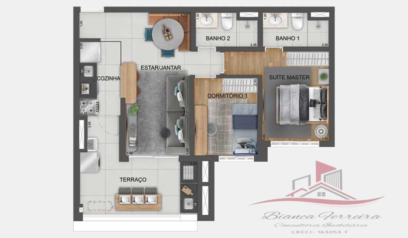 • 2 Quarto(s), 1 Suíte(s), 2 Banheiro(s), 1 Vaga(s)